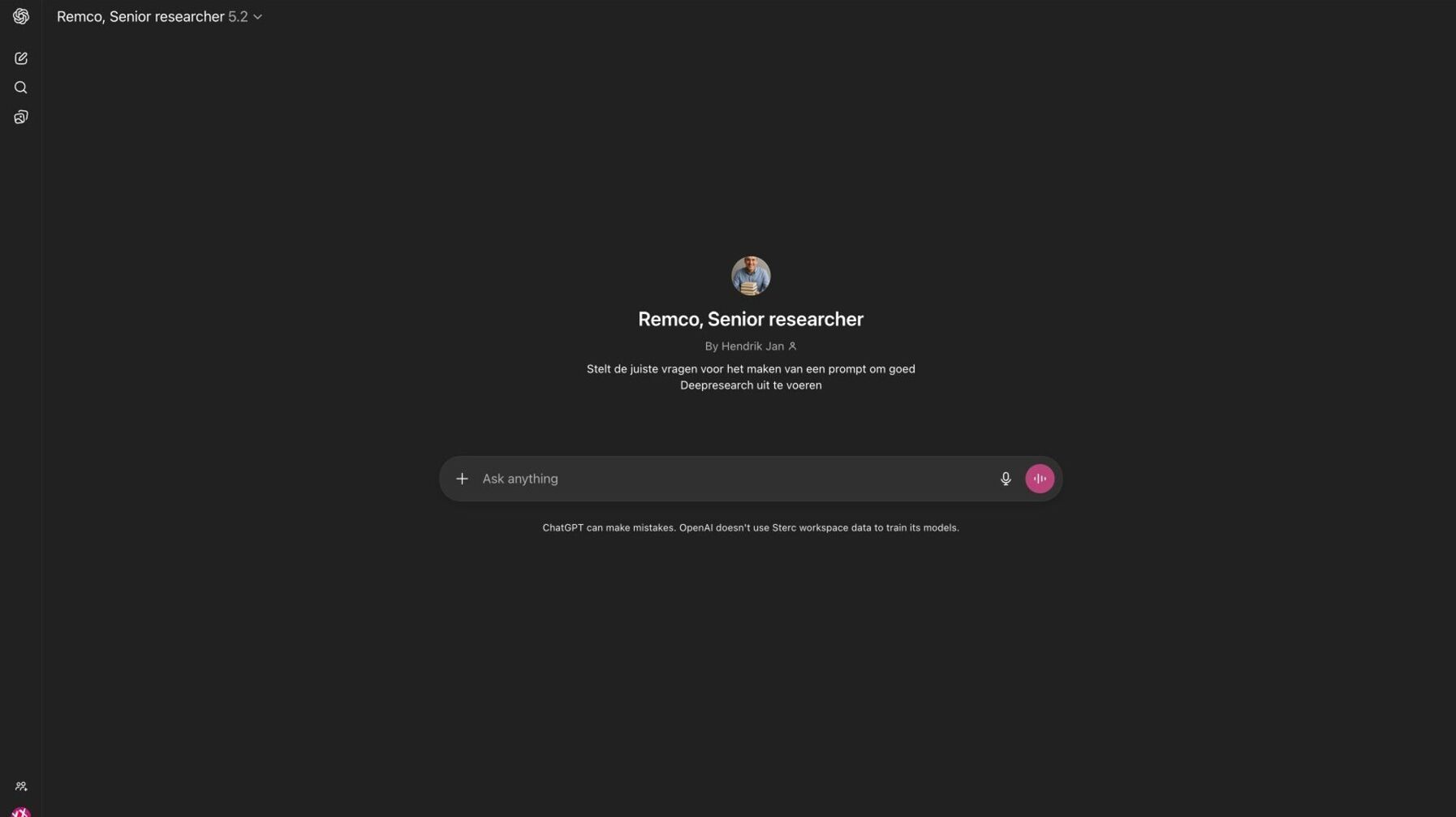 Laat het duidelijk zijn: zonder goede opdracht krijg je middelmatig onderzoek. Bij Sterc gebruiken we onze custom GPT Remco de Researcher om ons te helpen de juiste prompt te genereren voor Deep Research. Zelf ook inzetten? Bekijk hier de instructies van Remco de Researcher en creëer je eigen.