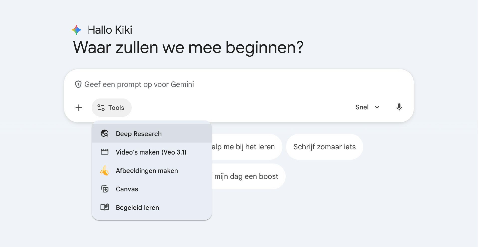 - Open Gemini en kies 'Deep Research' uit de tools.