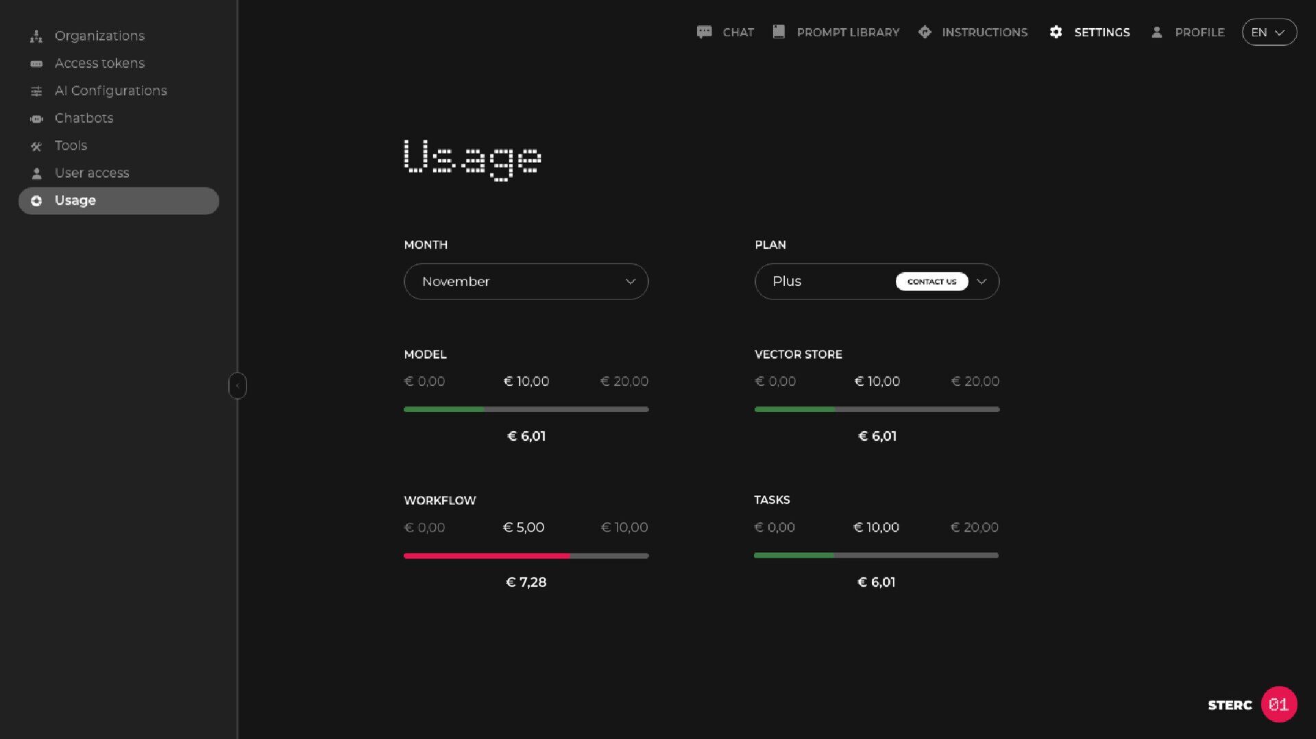 In de Usage-sectie zie je precies hoeveel tokens je hebt gebruikt, per maand en per onderdeel: