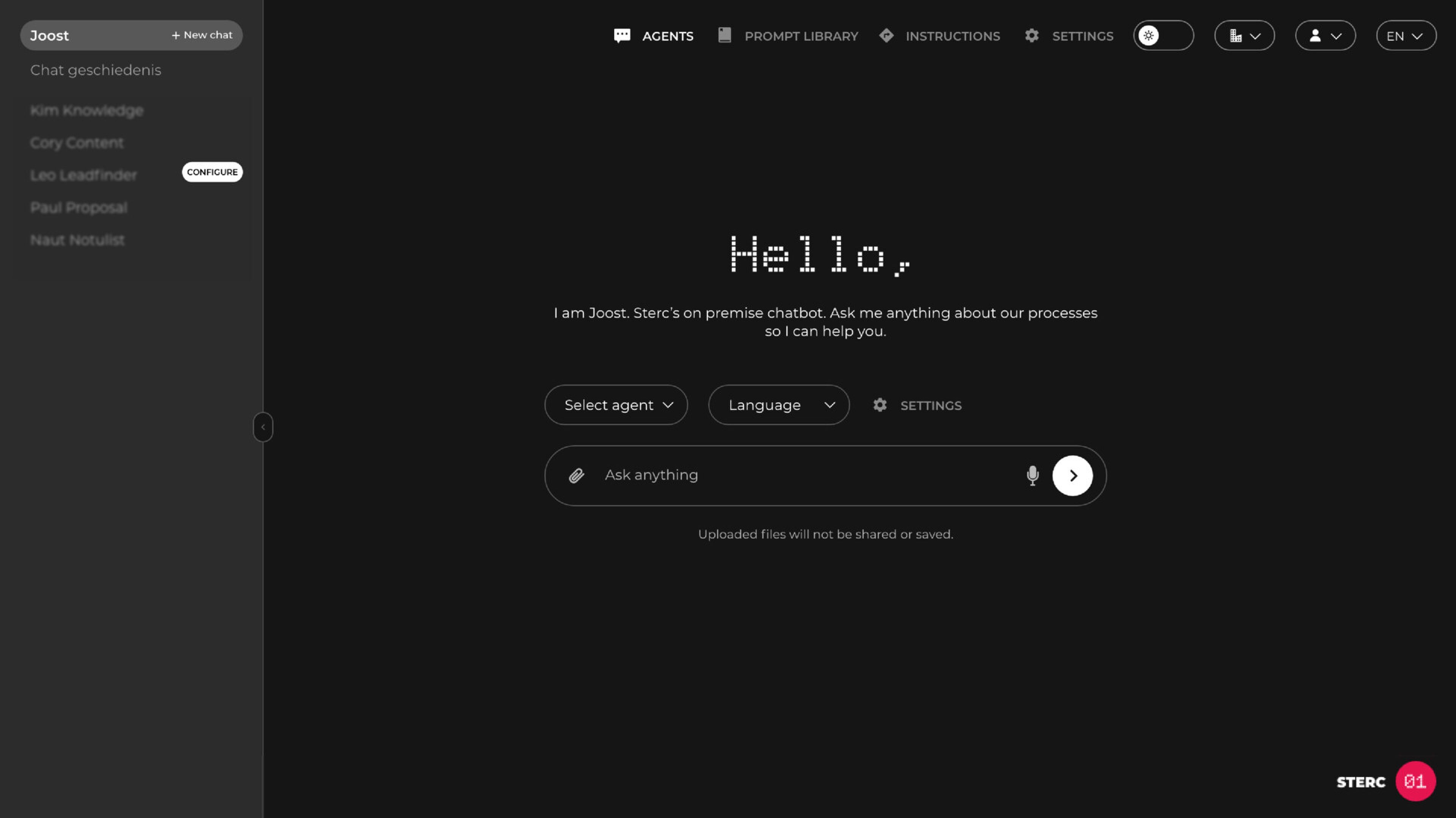 In het Sterc.ONE platform werk je met een set standaard agents (Enterprise) en custom AI’s, altijd getraind op jouw organisatie. Links zie je je persoonlijke agentenlijst: van notulist tot leadfinder, allemaal klaar om te knallen.